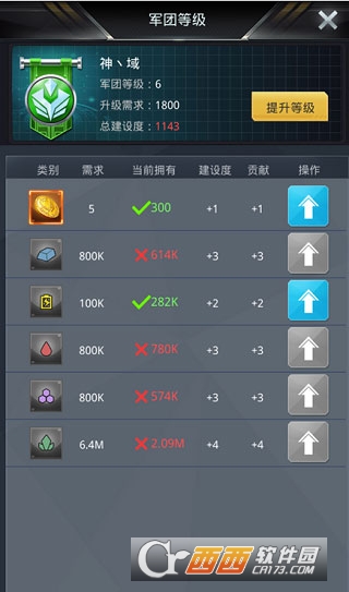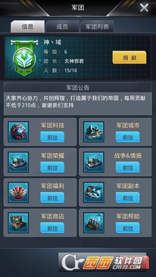 2、军团科技的提升也主要靠捐献,捐献规则同军团主等级,每天每种资源2次就好。