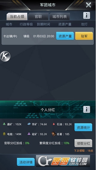 1、军团城市是军团一大福利。城市战每周2,4,6八点开启,九点结束。每个军团只能占领1个城市,故而选择好目标全力进攻就好。军团主力七人进攻中间,其余人抢东南西北四线。一般没有强力军团抢的话拿下不难。这里要注意一点,一个城市一个部位只能1个部队,多了自动返回。