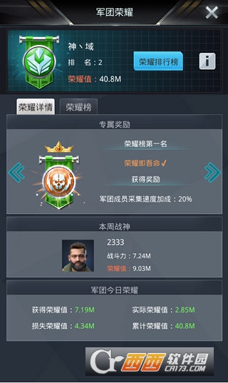 1、军团荣耀能体现一个军团的凝聚力。攻击其他玩家胜利就能获得荣耀值,但是如果受到攻击失败也会减少荣耀值。每周荣耀榜前三成员的采集速度都会增加,第一名加20%,第二名10%,第三名5%。同时每周前三成员在周日都能获得结算奖励,非常划算。故而加个强力军团就显得非常重要。