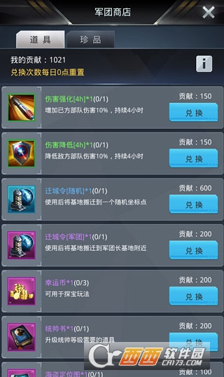 1、军团商店也是军团福利之一,军团成员能够消耗军团贡献来换取超值道具,其中既包括基础资源,也包括军官培养道具,幸运币,武器改造工具,还有高级航母置购合同,奖励非常丰富。同时还有珍品商店,每日0点,12点,18点重置商品,其中还包括红色士兵。