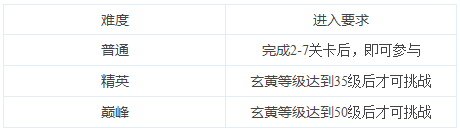 英雄试炼也分为三个难度,难度越高了,掉落的物品越多。每个难度开启的玄黄等级要求也不同,具体玄黄等级要求如下:
