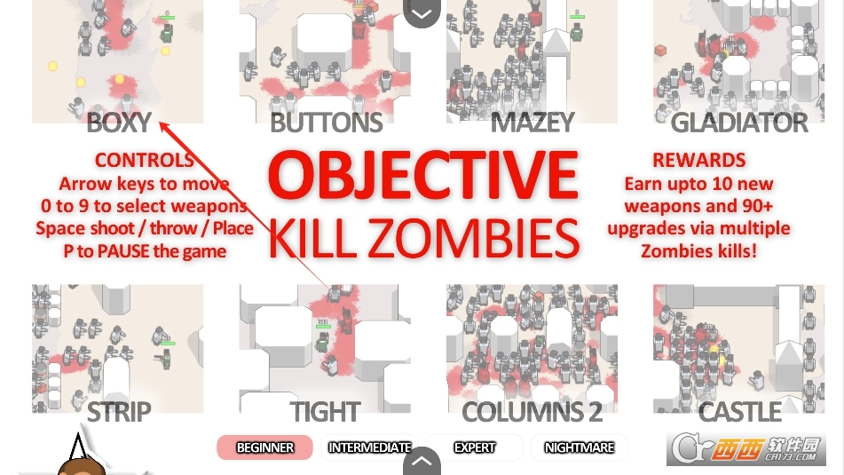 操控角色在地图上移动,避开僵尸的包围,用武器射击它们,每打死一只僵尸得分数,攒够分数能升级武器,比如从手枪换成霰弹枪、冲锋枪,威力和射速都提升,对付大量僵尸更轻松。