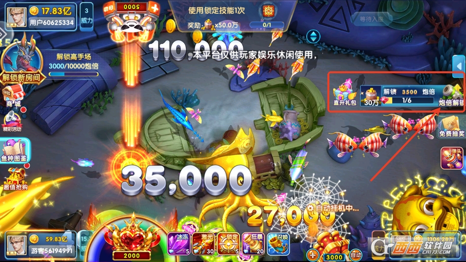 综合成长玩法:玩家可解锁不同场景渔场,8级解锁奇海湾、30级解锁龙宫,每个渔场鱼类倍率与BOSS类型不同;通过赛季争锋系统完成任务,积累赛季积分提升段位,获取专属装备如承影翅膀、神魔天剑;利用背包道具强化炮台,从基础炮台逐步升级为高倍炮台,提升捕鱼效率。