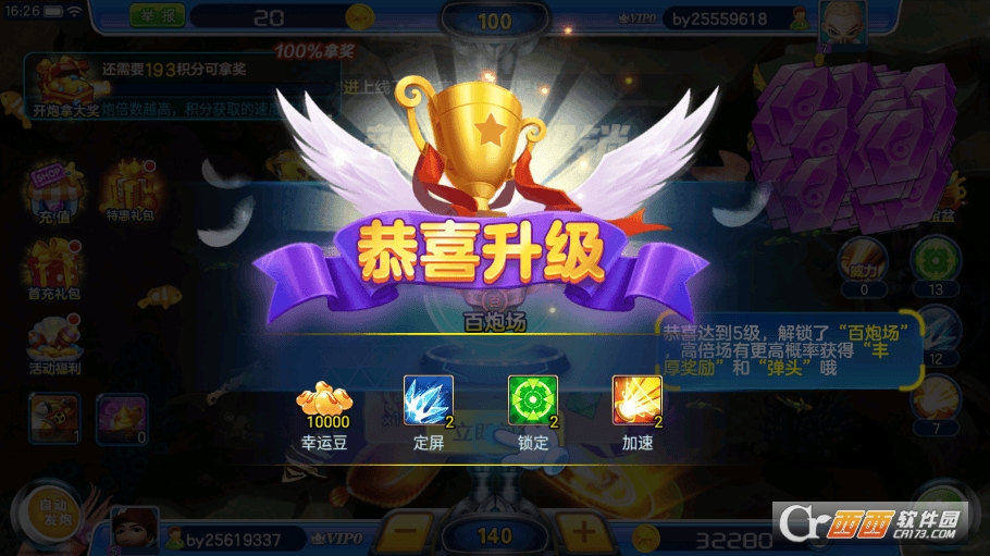 2、道具与炮台使用,玩家可在游戏中选择不同道具(如渔网扩大、射速提升等)和炮台,根据场上鱼类分布灵活切换,提升捕鱼效率,增加得分机会。