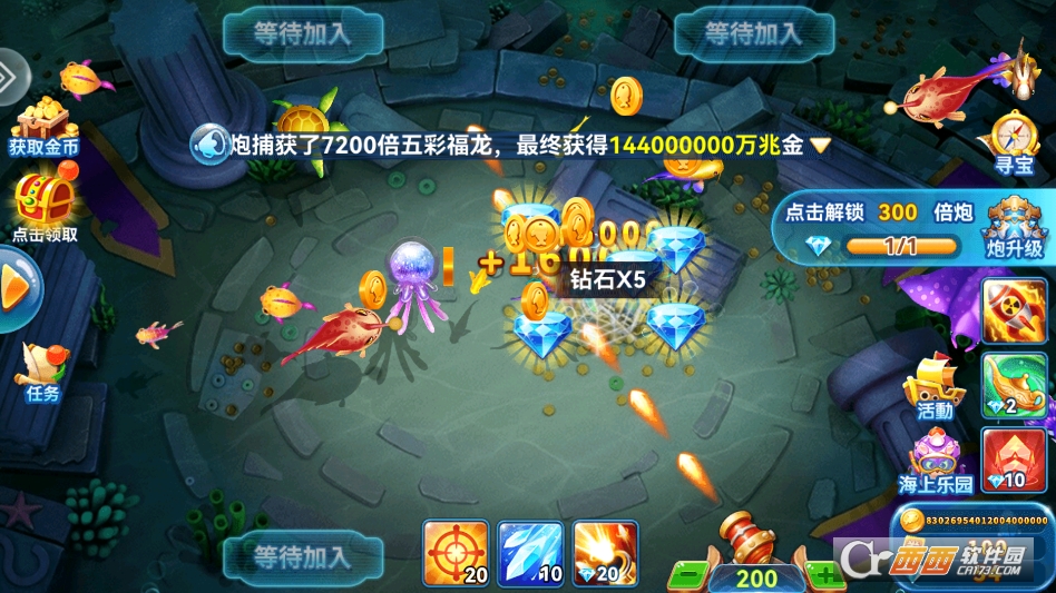 第一个主打玩法是“多人联机房间,实时组队捕鱼”。游戏分不同倍率的联机房间,玩家可以根据自己的炮台等级选择,也能邀请好友一起进入专属房间。房间里所有玩家共享渔场,一起捕捉鱼类、挑战BOSS,谁输出高、运气好,拿到的奖励就更多,还能和其他玩家比拼捕鱼技巧,互动性超强。