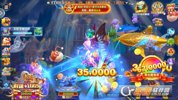 狂暴与蓄力机制:能量条蓄满可触发狂暴模式,此时炮台发射速度与威力倍增;同时具备能量蓄力系统,长按发射键可控制炮弹强度,搭配不同倍率炮台(最高10亿倍)提升捕鱼效率。