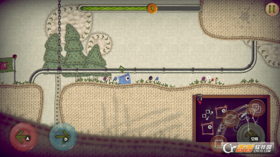 画风是真的绝,完全是手绘的纺织艺术风格,看着就像童话书里跳出来的。整个2D世界全是纺织元素,毛线拧成道路,纽扣做成机关,连背景都是布料拼接的,颜色鲜亮又柔和,每帧画面都像艺术品。