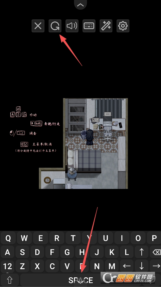 然后点击上方菜单的旋转按钮和下方的中间按钮,即可竖屏通过下方虚拟键盘操作