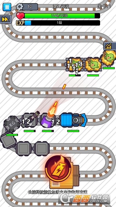 能量加速机制:战斗过程中,长按屏幕中间的能量按钮即可释放能量,该操作能同时显著提升火车的前进速度与所有车厢炮塔的攻击速度,可快速突破敌人密集的区域或大幅缩短单波战斗时间。