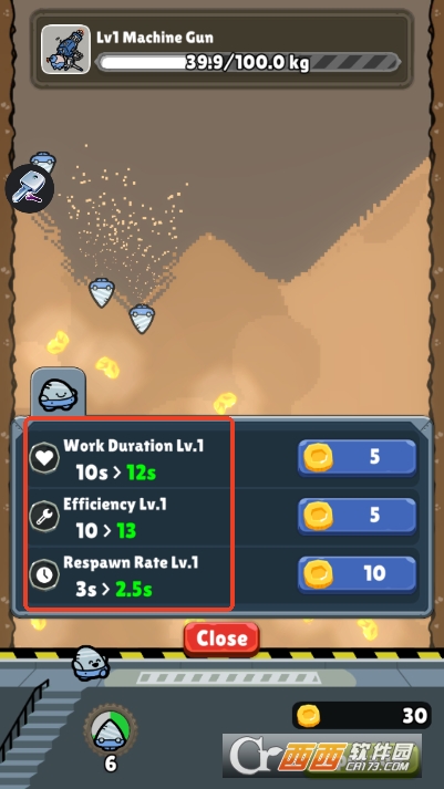 多元成长体系:除矿工升级外,还提供多种实用采矿设备(如 Lv2 Bomb、Lv1 Machine Gun),设备可通过资源升级提升性能(如增加挖掘重量、效率),同时角色设计贴合各自能力特点,玩家可根据需求搭配专属采矿团队。