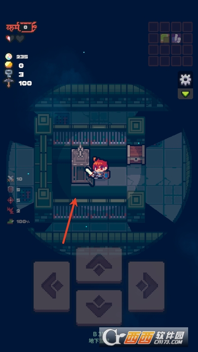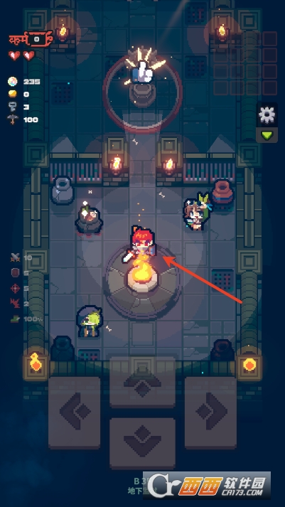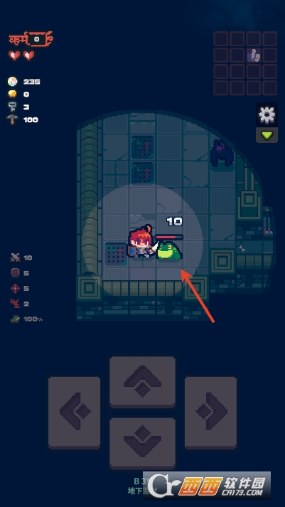基础操作与探索流程:进入游戏后点击屏幕开启冒险,通过屏幕中间箭头控制角色移动,角色触碰到敌人会自动攻击无需额外操作;每次前往地牢下一层都会进入全新随机房间,房间内会触发宝箱、陷阱等随机事件并提供各类实用道具,被怪物击败或成功到达终点后将自动返回安全区休整。