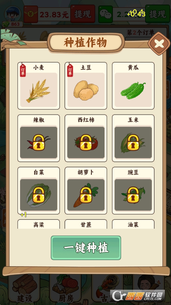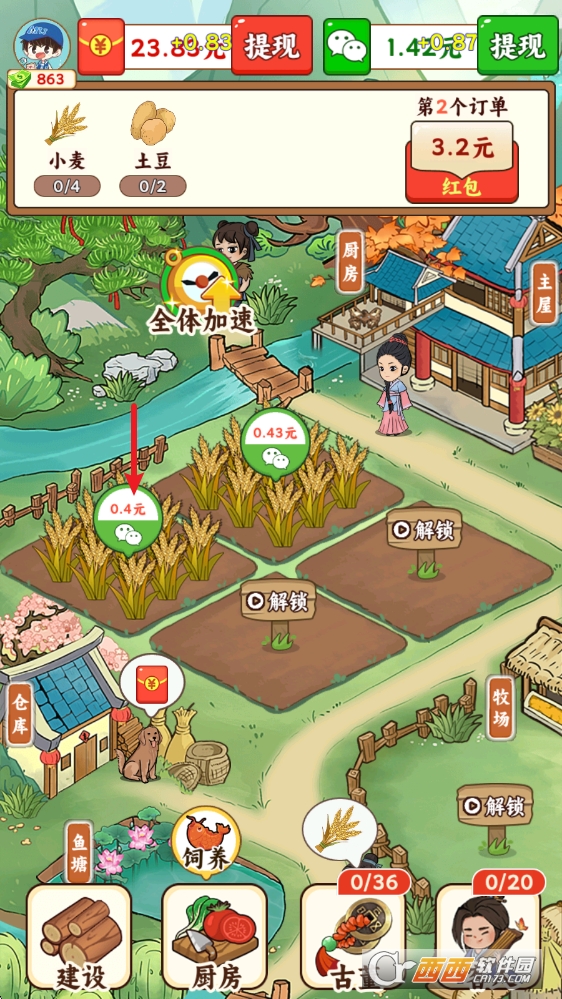 你会从零开始经营一座小农庄,刚开始有一小块空地和基础种子,播下种子、浇水施肥,等成熟了卖掉就能赚游戏收益,积累多了就能解锁红包。玩法越解锁越丰富,除了种小麦、蔬菜这些基础作物,还能养小鸡、小鸭,甚至解锁神秘场景。这些场景里藏着特殊作物,收益更高也更有趣。不用追着任务赶进度,完全按自己的节奏来。想休息的时候就让作物自己生长,回来收一波就能赚收益,真正做到休闲无压力。