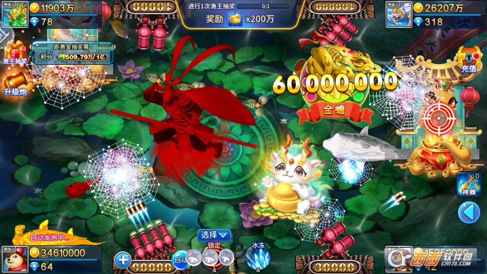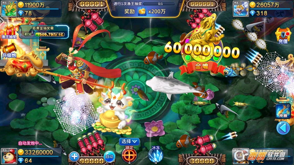 上线3款全新特效炮塔,分别是“雷霆炮”“冰封炮”“烈焰炮”。1.雷霆炮有概率麻痹鱼类,让目标停留在原地。2.冰封炮能冻结小范围鱼群,提高捕获成功率。