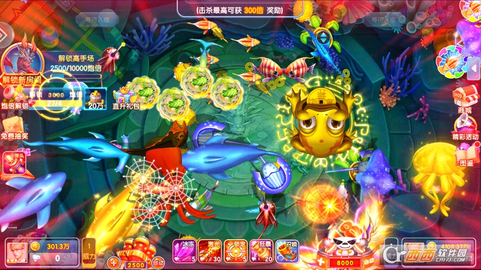 可以根据自己的需求选择不同的炮台,炮台等级越高,攻击力越强。升级炮台能提高捕获大鱼的概率,尤其是面对武侠BOSS时,高级炮台更有优势。BOSS从渔场边缘探出头时,是最好的捕获时机。