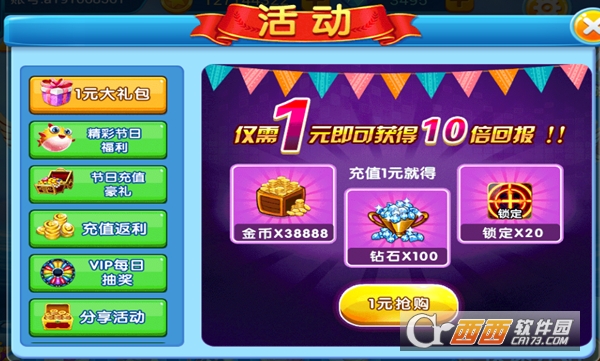 另外新版本还设有1元超值礼包,充值1块钱即可获得大礼包(38888金币+100钻石),详情点击主界面的【活动】-【1元大礼包】,活动多多,奖品多多,快来梦幻捕鱼开一局~