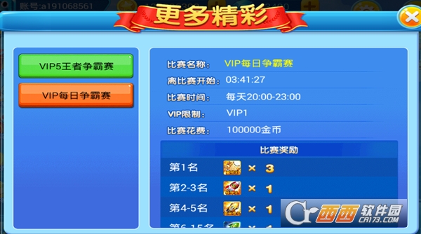VIP5王者争霸赛:每天18:00~24:00可以参与,排名越靠前的玩家奖励越好。