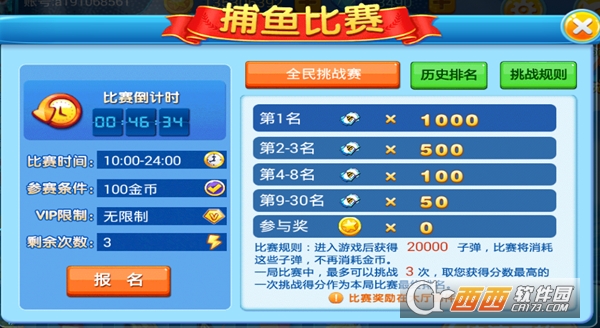 全民挑战赛:进入游戏后获得20000发炮弹,有限炮弹的情况下的分排名越靠前的玩家最终奖励越好。