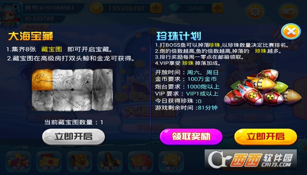 大宝藏:高级房击杀双头鲸和金龙时有概率获得“藏宝图”,收集齐8张藏宝图后可以进入大海宝藏地图进行挑战。大鱼好打,福利多多!