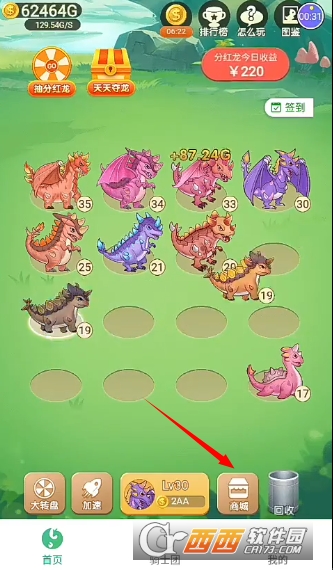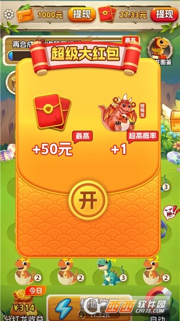 核心合成养成:开局从 2 条小龙或龙蛋起步,通过拖拽相同等级的恐龙 / 龙蛋合成更高级品种(如从普通龙合成至五福龙、分红龙),高级龙可提升金币产出效率;当养龙位置满时,需回收低阶龙腾出空间,也可在商城购买新恐龙扩展阵容,同时每次合成新恐龙均可解锁红包奖励。