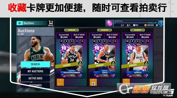 卡牌收集与球队养成:通过开包、任务奖励、拍卖行交易获取现役 / 传奇 NBA 球员卡牌,每张卡牌有独特能力值、稀有度与技能加成;同时支持球员升级、装备强化、技能点分配,可依据战术定制球员成长路径,打造专属冠军阵容。