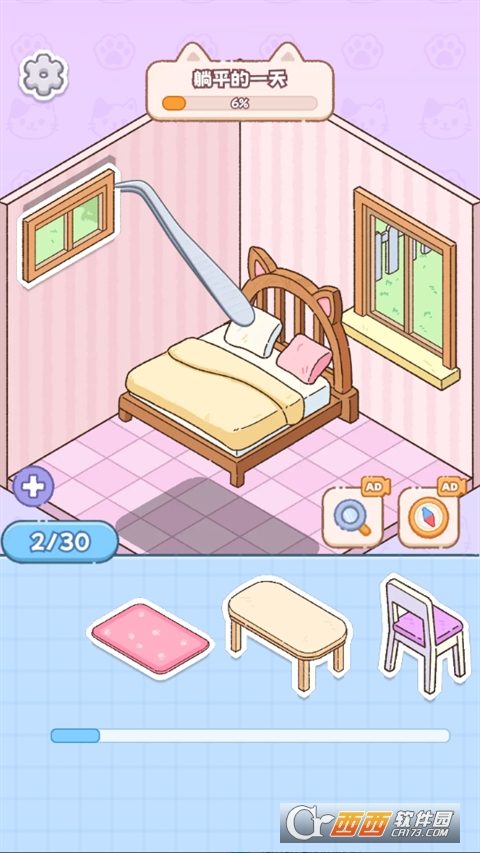 1、进入游戏后,拿起你的小镊子,把各种各样的家具和物品贴到它们该去的地方