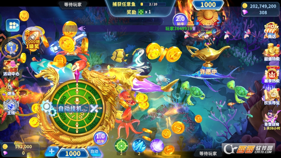 3. 主题渔场模式,开放了多种不同风格的主题渔场,包括美人鱼渔场、海盗船长渔场、异兽主题渔场等。每个主题渔场都有专属的稀有鱼类和BOSS,解锁条件不同,奖励也更加丰厚,玩法多样性十足。