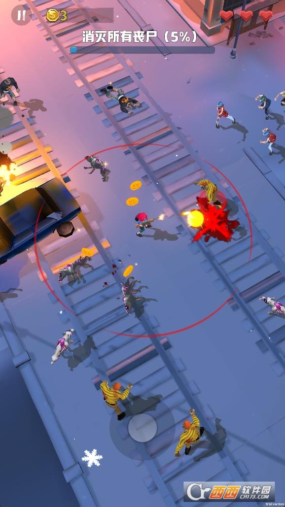 《僵尸战争前线》是一款极具解压感的闯关射击佳作,以末日丧尸题材为核心,凭借简单易上手的操作与丰富的战斗体系,成为休闲与硬核玩家皆爱的作品。游戏中,玩家将化身末日幸存者,直面一波波汹涌的丧尸浪潮,在多样关卡中展开生存之战。玩法上采用自动攻击 + 手动移动的便捷模式,滑动摇杆即可操控角色灵活走位,脚下绿色圆圈为攻击范围,进入区域的丧尸会被自动锁定消灭,无需复杂操作就能享受射击快感。每关都有独特的丧尸类型与Boss挑战,通关后可斩获丰厚金币,用于升级武器火力、解锁暴击、攻速等天赋,或是解锁高阶武器与专属道具。