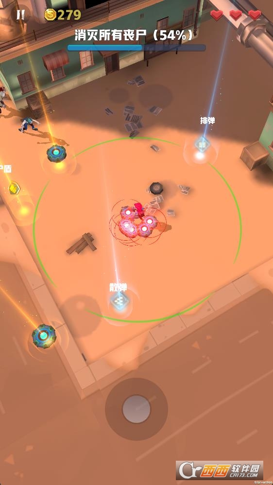 自动攻击+手动移动的闯关模式:进入关卡后滑动摇杆操控角色移动,角色脚下绿色圆圈为攻击范围,进入范围的僵尸会被自动攻击;需消灭当前关卡所有僵尸即可通关,通关可获得金币奖励,用于升级武器和解锁天赋。