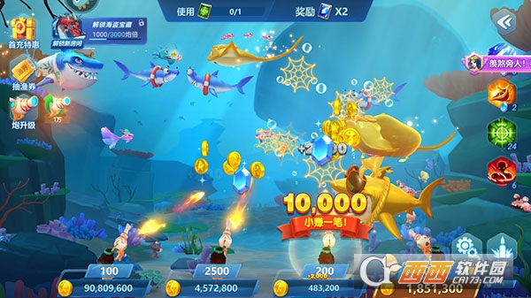3. 丰富道具与技能系统,提升捕鱼效率。包含锁定、冰冻、暴走、核弹等多种强力技能,关键时刻使用能瞬间逆转局势,轻松捕获高难度鱼群。还有不同等级的炮台可解锁升级,倍率越高火力越强,捕获大额奖励的概率也越高。