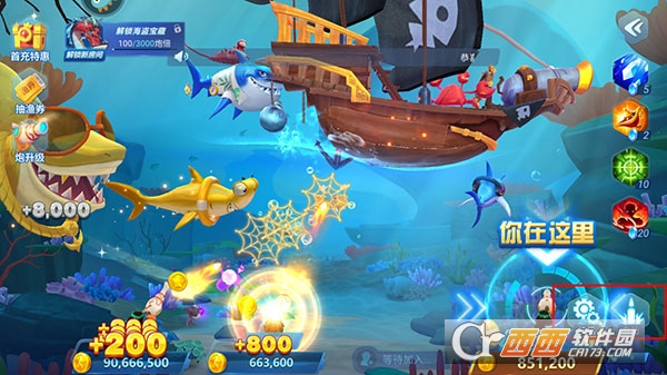比如乌龟游到右上角快出屏幕的时候,比如河豚在屏幕中间偏右一点出现的时候,比如魔鬼鱼在屏幕左侧向上游,背对你的时候。还有很多固定点,需要长期观察。但我们并不是用这个来赚金币。这只是一个标志,或者对比点。用来判断此时的命中率。