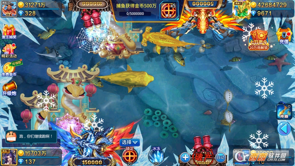 4. 技能与道具助力玩法,捕鱼过程中积累的能量满值后,可解锁能量炮,提升30%的捕鱼成功率。还能使用冰冻弹、狂暴等特殊技能,冰冻弹可冻结全屏鱼群方便捕获,狂暴技能能让炮台攻击力短时间翻倍。此外,弹头道具可对BOSS一击必中,轻松斩获高额奖励。