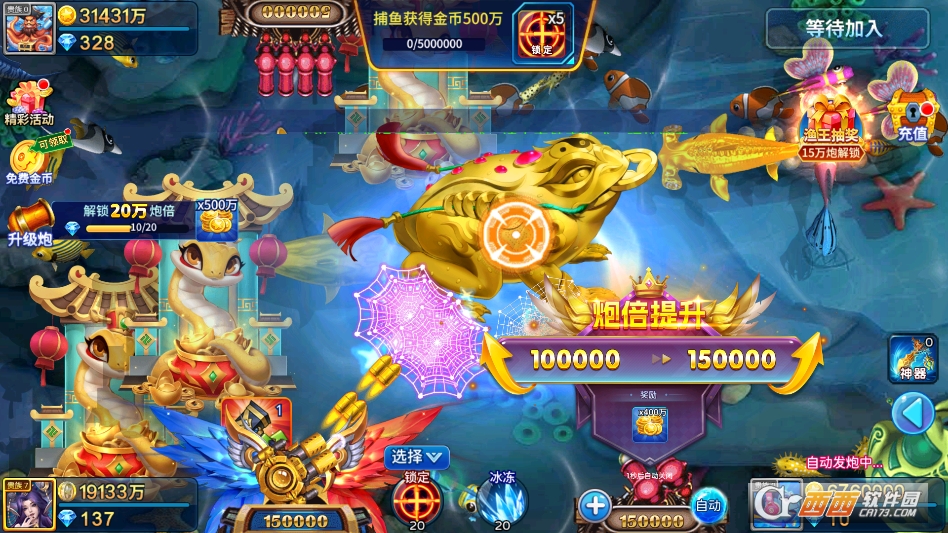3. 全国联网竞技玩法,玩家可进入多人渔场参与实时对战,系统会快速匹配实力相当的对手。对战过程中,捕鱼获得的金币会同步转化为竞技积分,对局结束后根据积分排名发放奖励。排名越靠前,获得的金币、钻石等奖励越丰厚,还能提升自己的全国排名。