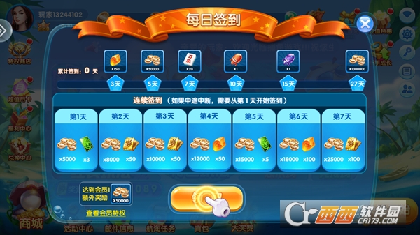 1、进入疯狂捕鱼无敌版游戏内我们可以先来领取每日签到奖励。