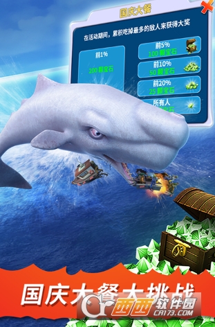 生存进化玩法:玩家操控鲨鱼在海洋中遵循 “弱肉强食” 法则,通过吞噬海洋生物、人类等猎物补充能量,避免饿死;持续进食可提升等级、增大体型,从初始礁鲨逐步进化为巨齿鲨、沧龙等巨型鲨鱼,最终成为海洋霸主,存活时间越长,获得的金币、钻石奖励越丰厚。