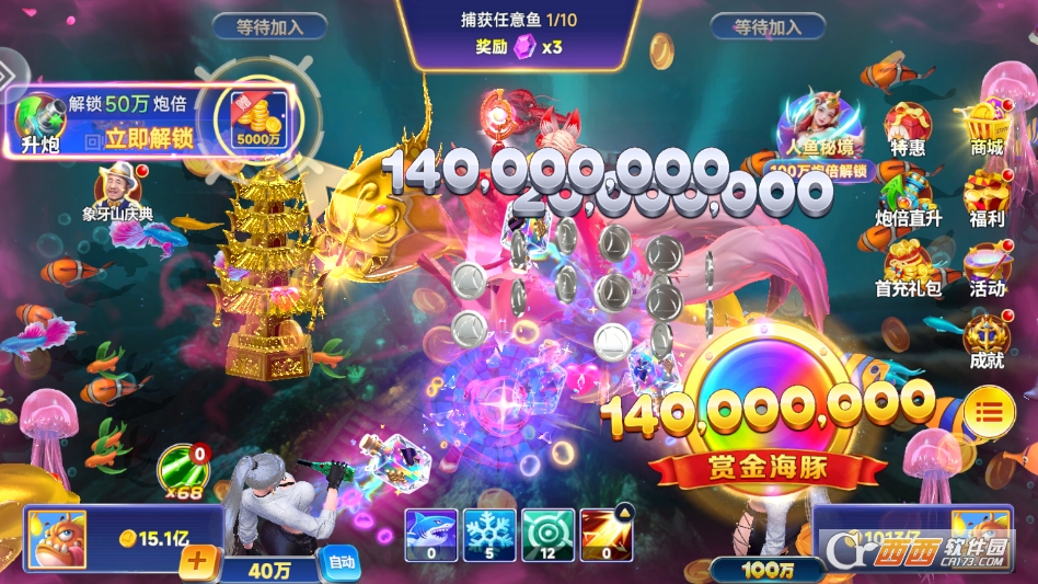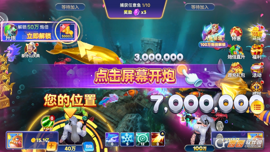 2. 多人联机竞技玩法,实时对战比拼实力。支持邀请好友组队或匹配全球玩家同台竞技,共同挑战高倍数渔场和专属BOSS。通过捕获鱼类获取积分,积分排名靠前的玩家可获得丰厚的排名奖励,组队配合捕猎还能提升奖励加成,互动乐趣十足。