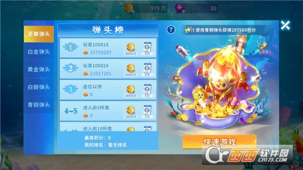 2、弹头乐园规则简单明了:使用弹头击杀鱼类即可赚取金币,同时生成对应积分值。每日积分最高者可登上排行榜,赢得额外的金币和奖券奖励,适合喜欢快节奏玩法的玩家。