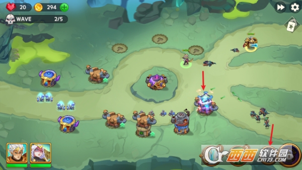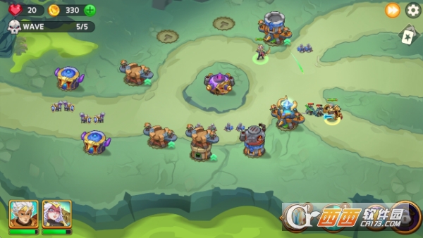 英雄与道具操控:可拖动英雄在战场移动战斗,释放专属技能;右下角特殊道具能让防御塔短时间进入“疯狂状态”,且炮塔支持叠加组合,解锁更强防御体系,应对多波次敌人。