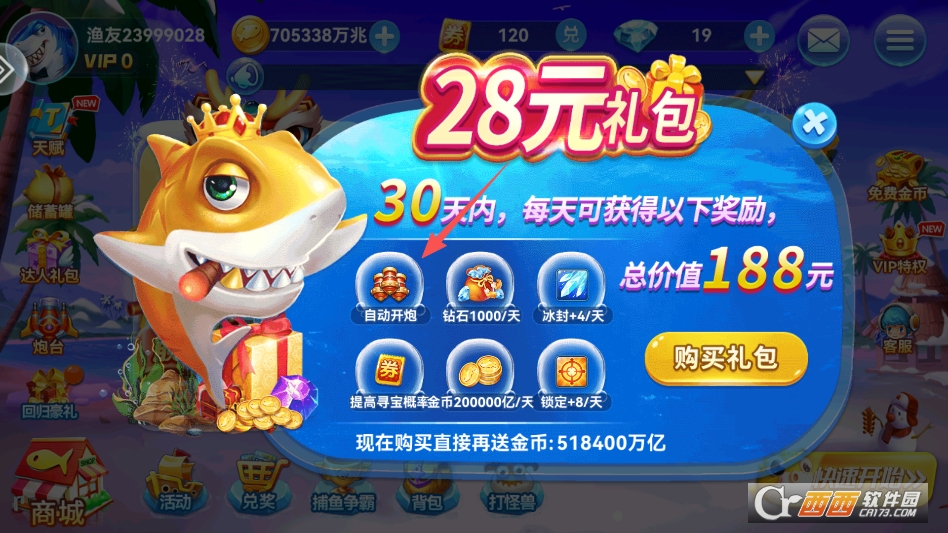 可以看到你需要购买达人礼包,才能为你解锁自动开炮的功能哦