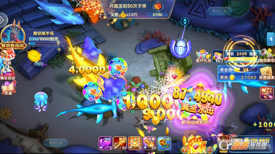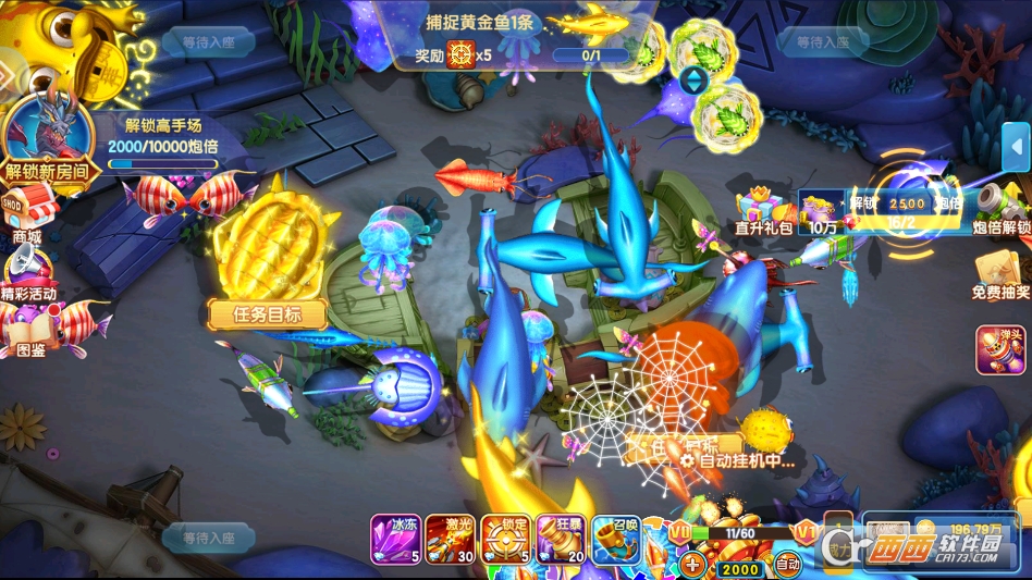 解答:不支持离线挂机功能,需要玩家在线实时操作。不过游戏支持自动攻击模式,开启后炮台会自动瞄准鱼群发射炮弹,玩家只需偶尔调整炮台方向和倍率即可,就算是工作间隙的碎片时间,也能轻松享受捕鱼乐趣。