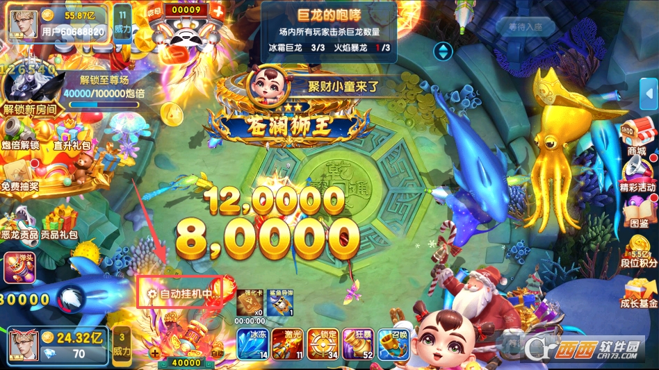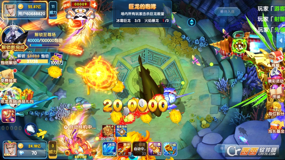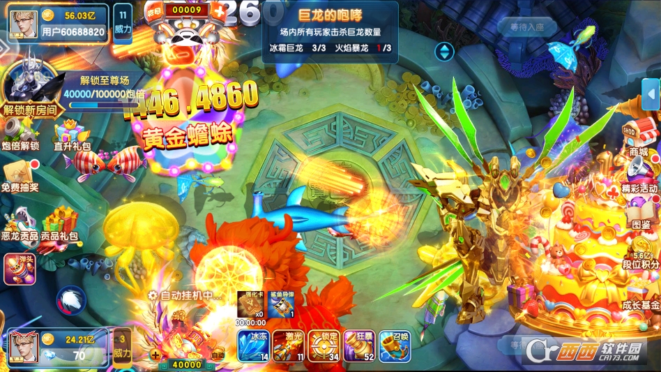 主打轻松休闲的游玩氛围,支持自动射击辅助功能。对于不想手动调整角度力度的玩家,开启自动射击后,炮台会自动瞄准附近鱼群发射,兼顾了操作党和懒人玩家的需求。同时游戏支持离线收益,就算不在线,也能积累少量金币,让碎片化时间得到充分利用。