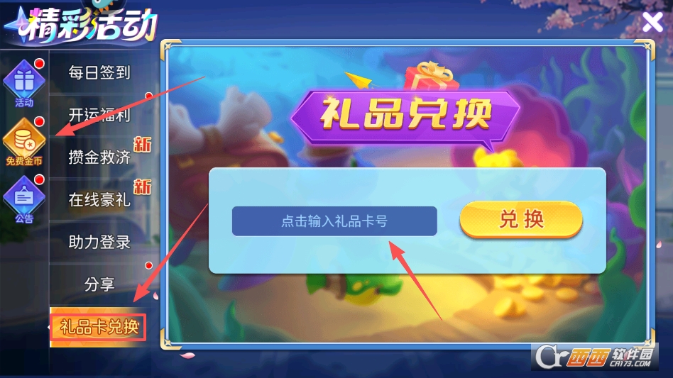 打开活动页面,点击左侧的免费金币专区,然后下拉列表到最下方,即可找到礼品码兑换功能