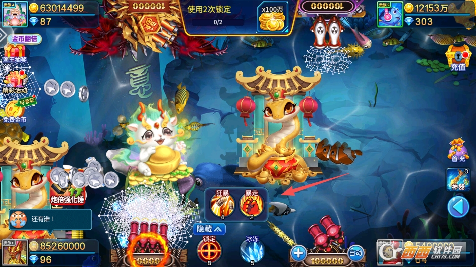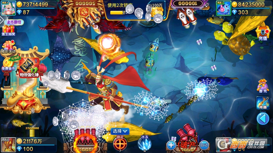 游戏游戏内不仅有百种常规鱼类,更加入了造型独特的BOSS鱼和主题鱼种,从霸气的机械鲨、风情的美人鱼到神话感十足的暗黑悟空,每种生物都有专属游动轨迹和技能机制。搭配千倍炮台系统,玩家可自由切换倍率,捕小鱼稳积金币,遇BOSS全力冲刺,每一次捕获都充满成就感。支持真人联网互动,亿万玩家同场竞技,让海底冒险不再孤单。玩家可组队挑战世界BOSS、参与跨服捕鱼大赛,既能比拼技巧,又能分享探险收获,在热闹的氛围中享受捕鱼与社交的双重快乐,真正沉浸在这场海底狂欢之中。