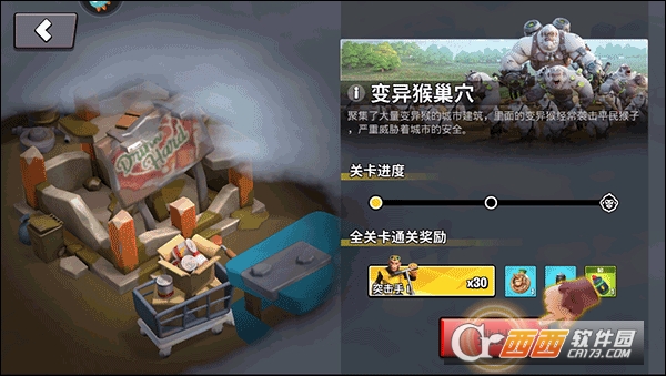采用3D卡通画风打造鲜活的猿族世界,角色造型憨态可掬又充满个性,从普通猿猴士兵到身怀绝技的斗士,每类角色都有专属外观与技能。场景细节丰富,废弃的人类城市遗迹、荒芜的野外荒原、充满科技感的航天基地交织,搭配搞怪音效与幽默剧情转场,打破传统SLG的严肃氛围,让策略对战更具趣味性。