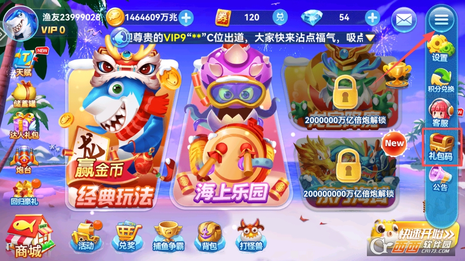 进入游戏主界面之后点击右上角按钮呼出菜单,找到礼包码按钮