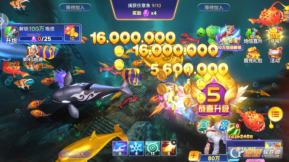 1. 倍率设定更良心,爆金爽感更足。同类游戏多以低倍率起步,高阶倍率解锁门槛极高,依赖氪金。这款游戏直接以千炮为基础倍率,十分钟内可升级至20万倍,200万倍终极炮台可通过游戏内积累解锁,零氪玩家也能体验高倍爆金快感。