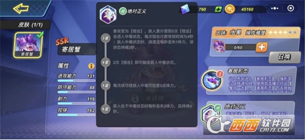 寄居蟹的被动攻击【绝对正义】在3星时解锁,可以通过普攻三次敌人使其中毒,在中毒状态敌人会减速并且丢失体力。