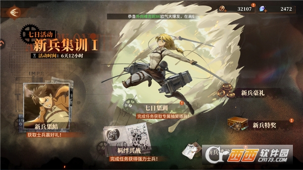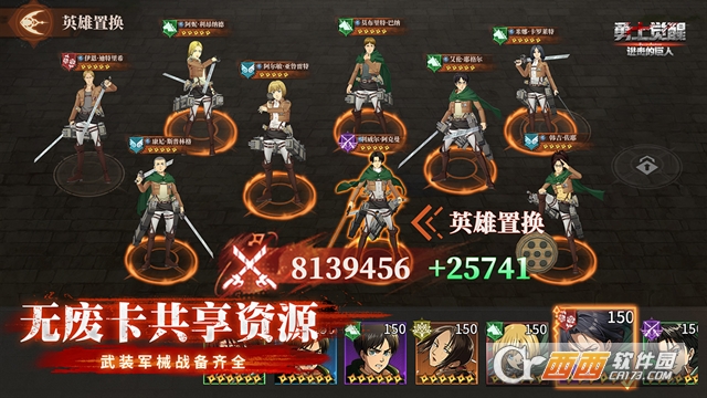 核心玩法围绕角色集结与战力强化展开,玩家可招募阿尔敏、伊尔泽、三笠、利威尔等经典角色组建专属队伍。通过冒险推图、副本挑战收集装备与经验,提升角色等级,搭配专属武器与套装,同时激活角色羁绊与巨人之力,全方位强化队伍整体战力,从容应对不同强度的巨人敌人。