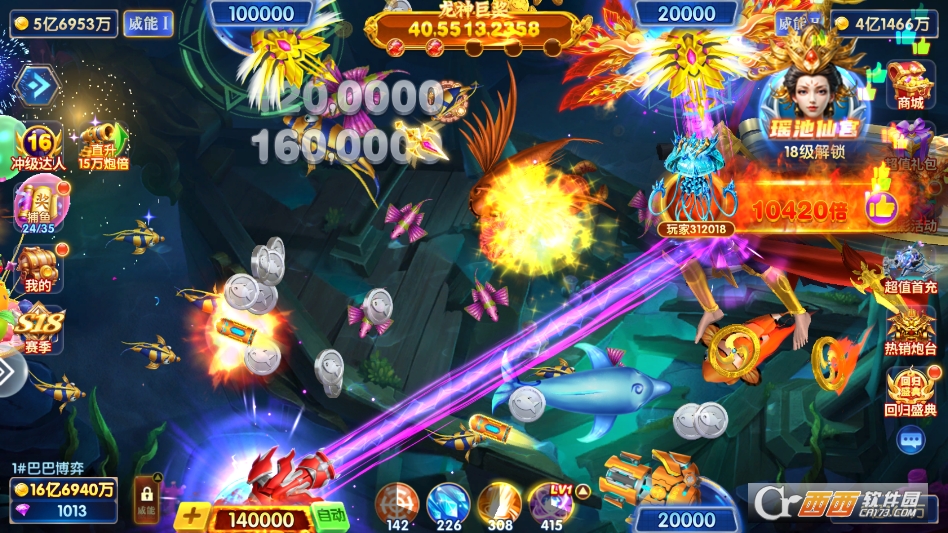 1. 3D场景沉浸式体验,视觉效果拉满。采用3D渲染与4K超清画质,打造层次丰富的深海奇境,珊瑚礁、发光水母等元素细节逼真,鱼类游动姿态自然灵动。爆金与道具触发时特效炫酷,金蟾吐珠等标志性场景绚丽爆发,带来极致视觉冲击。