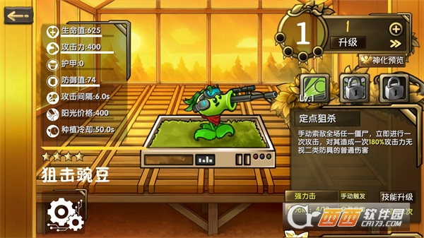 6、在准备界面点击植物图鉴可以查看拥有的植物,点击植物可以消耗金币对其进行升级提升属性。