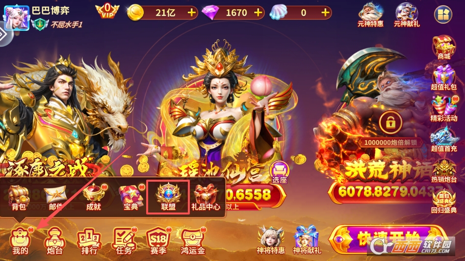 点击游戏主页左下角的我的,在呼出菜单中点击联盟按钮